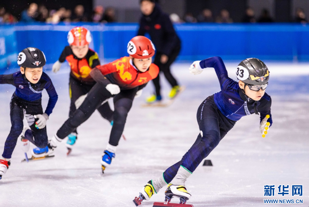 ??12月15日,參賽小選手在呼和浩特市冰雪運(yùn)動(dòng)系列活動(dòng)短道速滑公開(kāi)賽男子甲組500米比賽中。新華網(wǎng)發(fā)(丁根厚 攝)