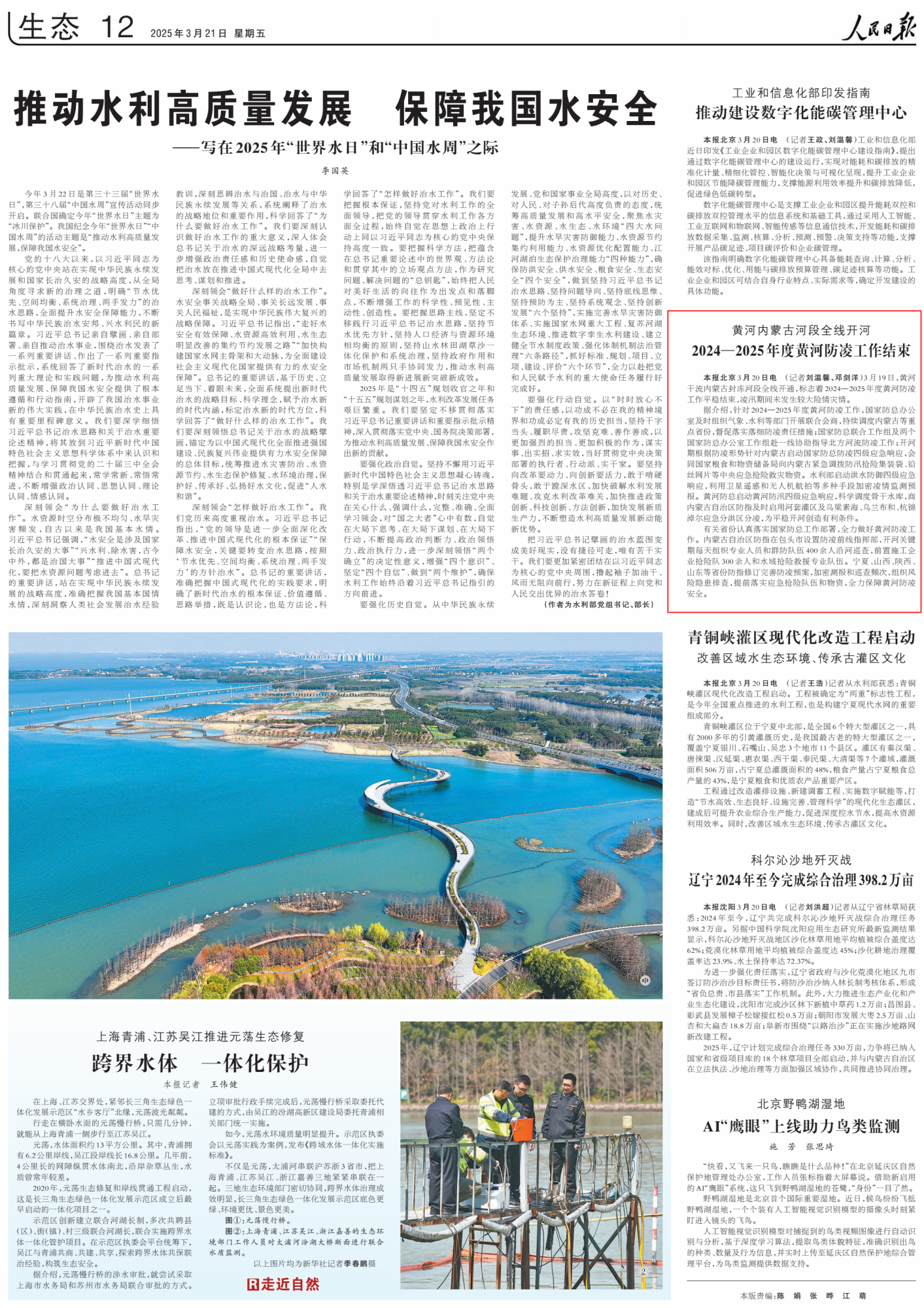 2025年3月21日,《人民日報》第12版刊發(fā)題為《黃河內(nèi)蒙古河段全線開河 2024—2025年度黃河防凌工作結(jié)束》的文章,報道了黃河干流內(nèi)蒙古封凍河段3月19日全線開通,標志著2024—2025年度黃河防凌工作平穩(wěn)結(jié)束,凌汛期間未發(fā)生較大險情災(zāi)情。