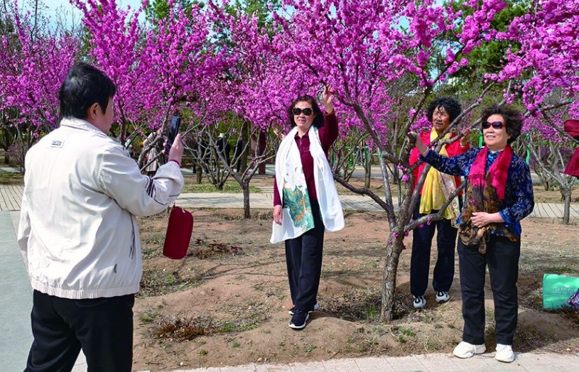 走進(jìn)植物園,道路兩側(cè)的榆葉梅競相綻放,粉紅色的花朵層層疊疊掛滿枝頭,形成一片爛漫花海。從浙江來的游客李筱正用手機(jī)記錄美景:“原本擔(dān)心錯(cuò)過北方花期,沒想到這里的榆葉梅開得這么漂亮,完全不輸江南的春天。”
