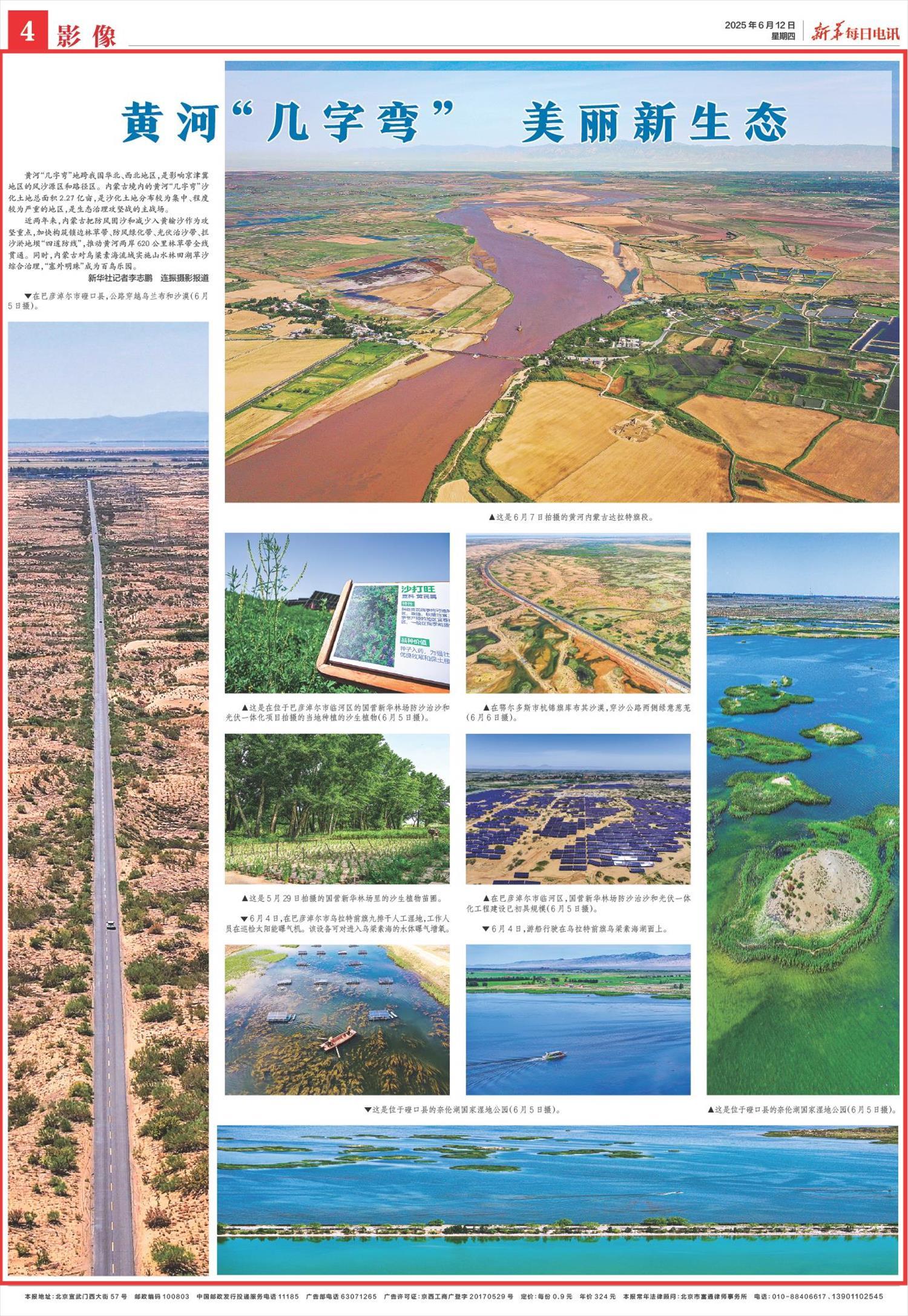 2025年6月12日,《新華每日電訊》第4版刊發(fā)題為《黃河“幾字彎” 美麗新生態(tài)》一文,報道了黃河“幾字彎”地跨我國華北、西北地區(qū),是影響京津冀地區(qū)的風沙源區(qū)和路徑區(qū)。內(nèi)蒙古加快構筑鎖邊林草帶、防風綠化帶、光伏治沙帶、攔沙淤地壩“四道防線”,推動黃河兩岸620公里林草帶全線貫通。