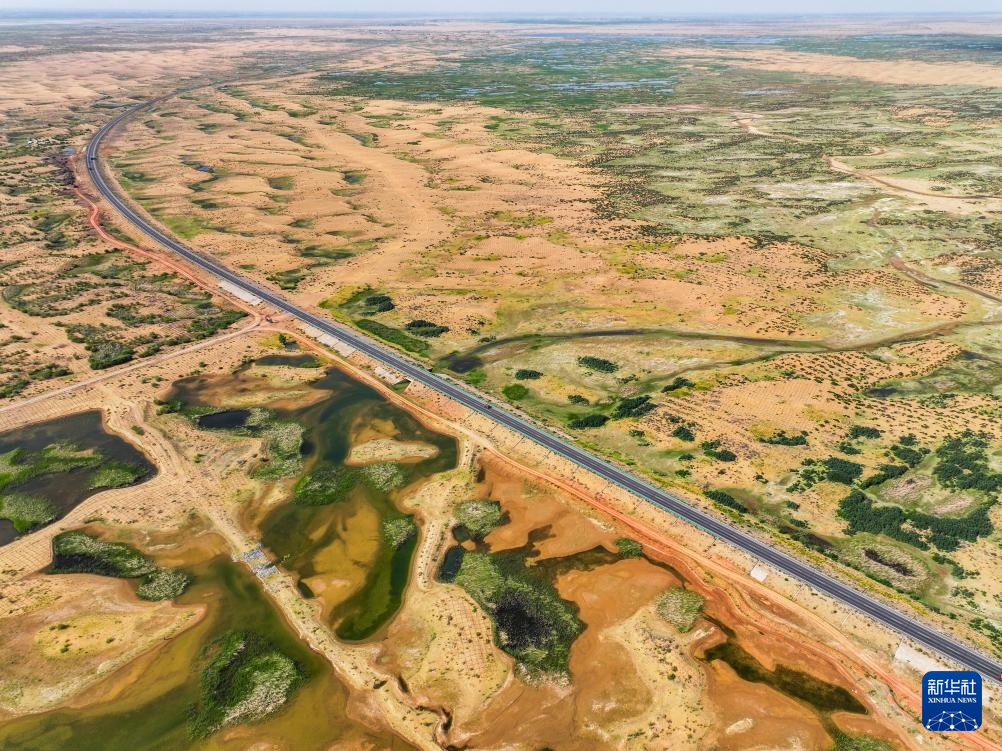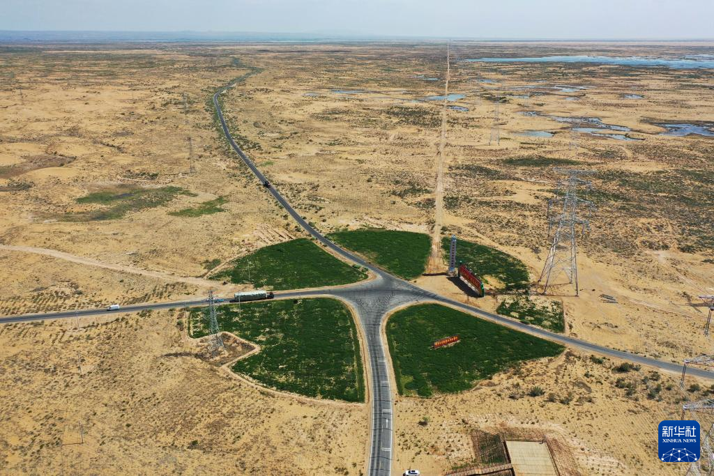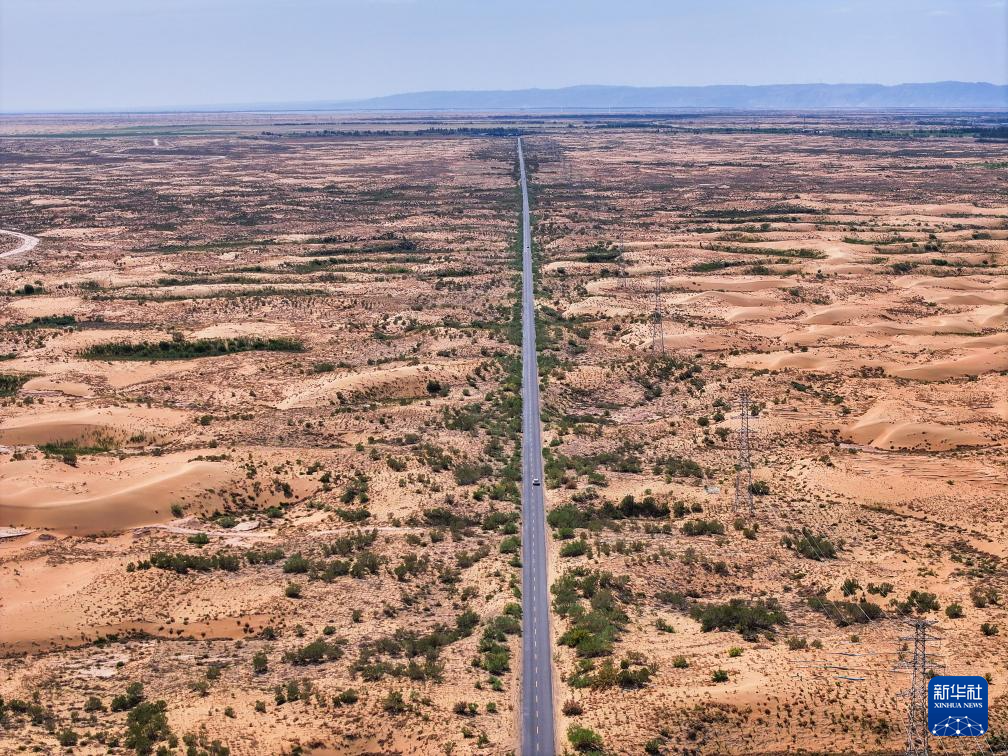在巴彥淖爾市磴口縣,公路穿越烏蘭布和沙漠(6月5日攝,無人機照片)新華社記者 連振 攝