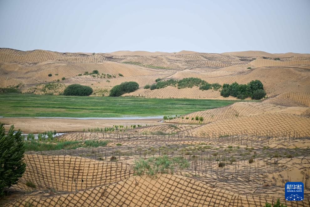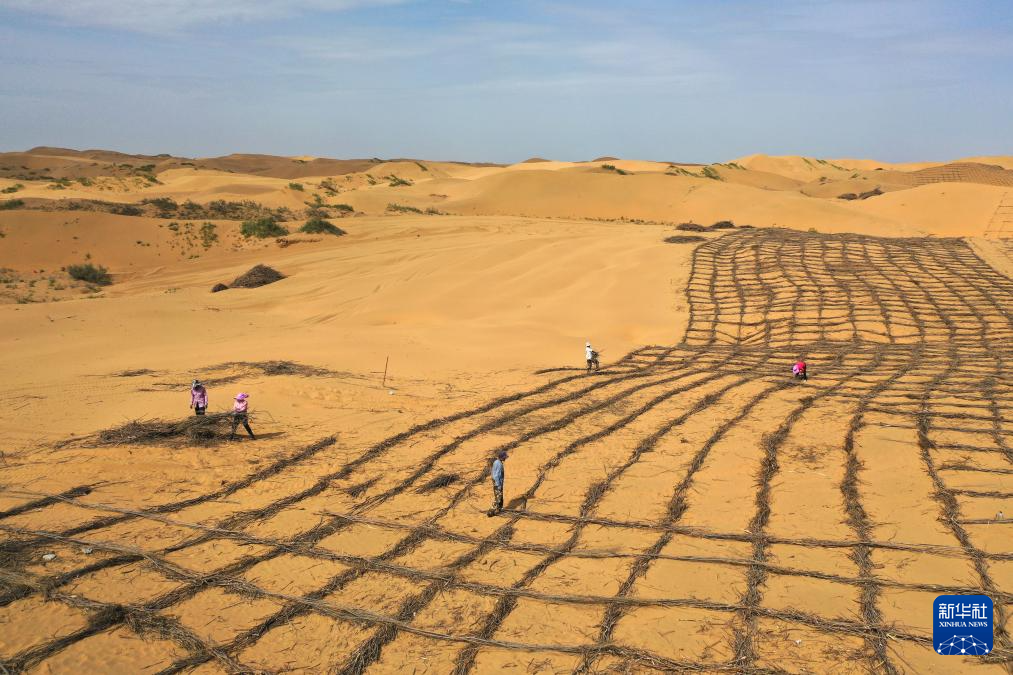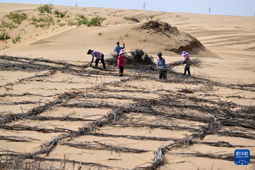 6月7日,在鄂爾多斯市達拉特旗境內(nèi)的庫布其沙漠,工人在治沙 新華社記者 李志鵬 攝