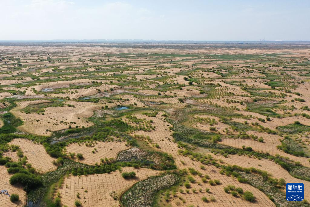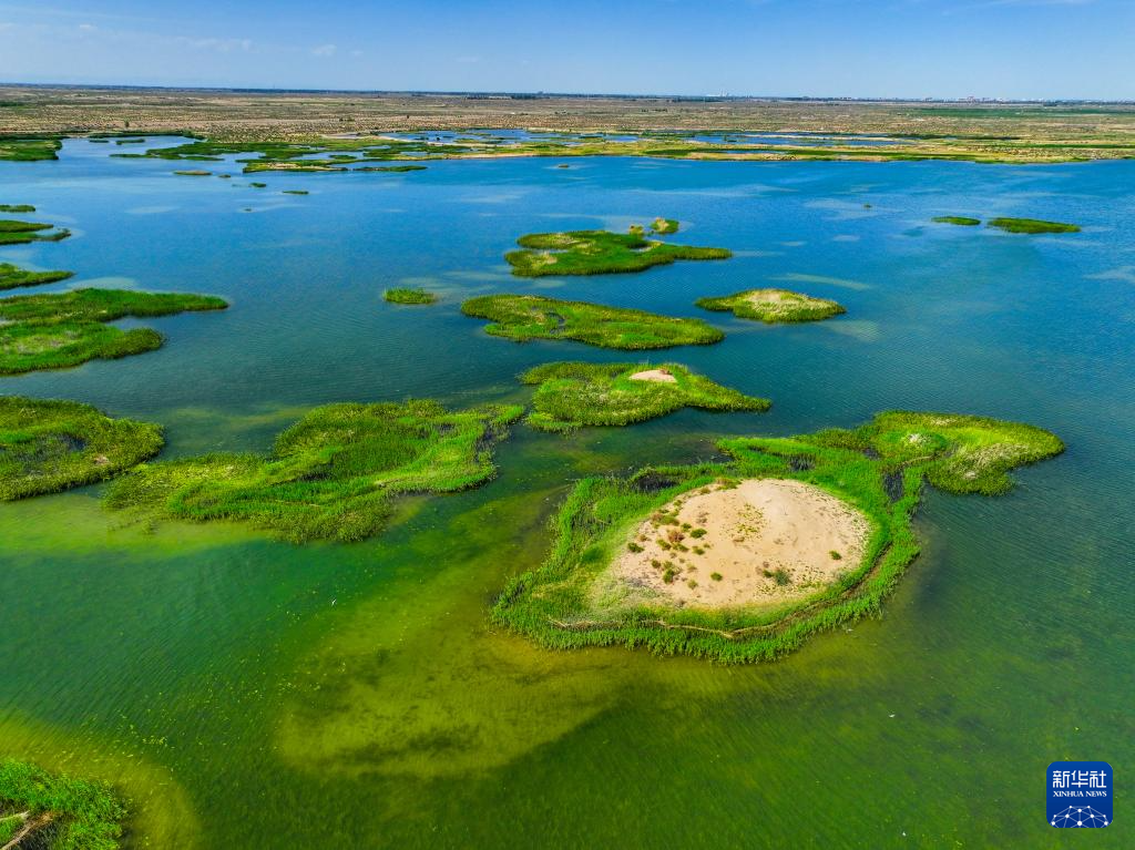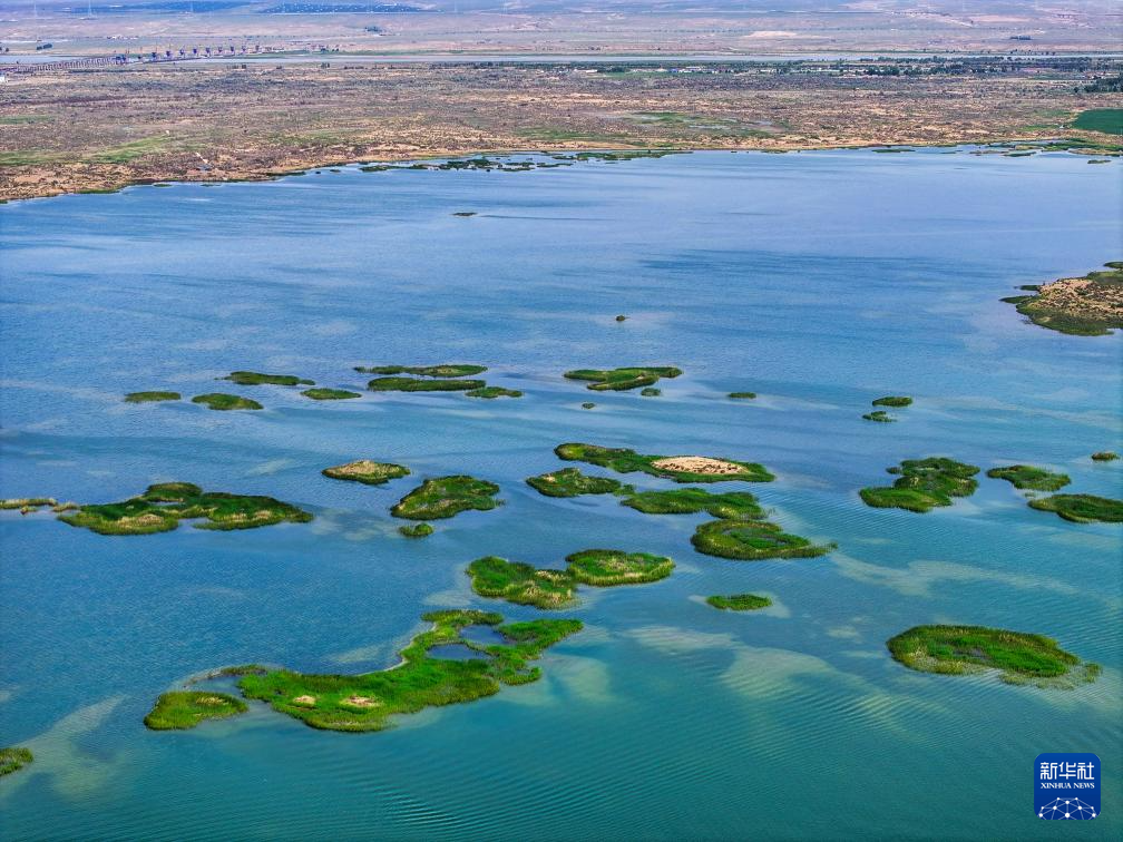 這是位于巴彥淖爾市磴口縣的奈倫湖國家濕地公園(6月5日攝,無人機照片)新華社記者 連振 攝