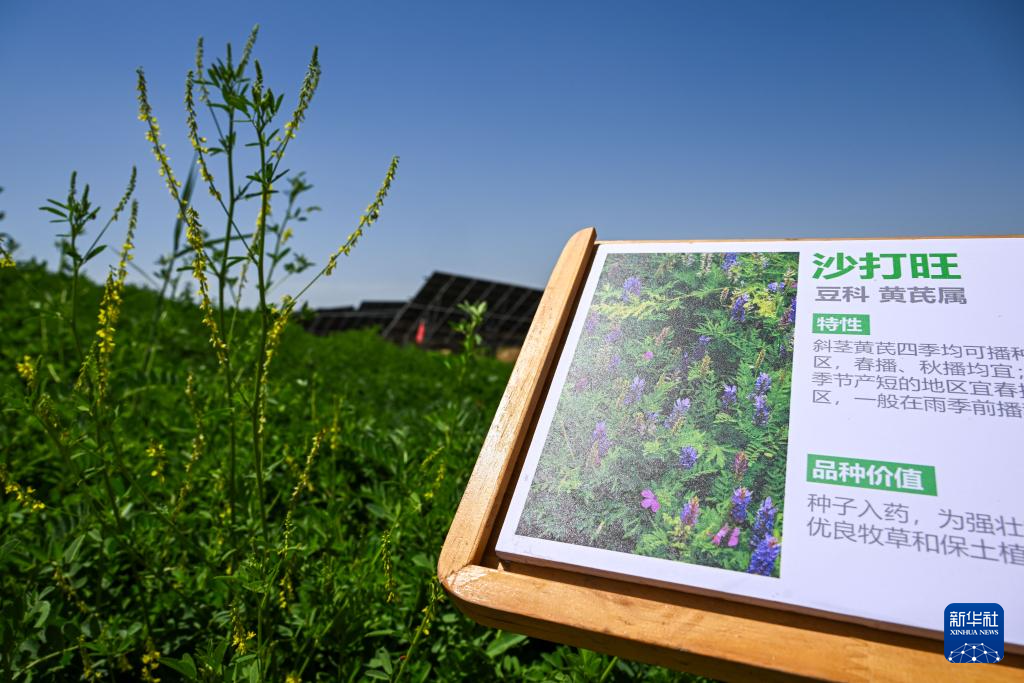 這是在位于巴彥淖爾市臨河區(qū)的國營新華林場防沙治沙和光伏一體化項目拍攝的當?shù)胤N植的沙生植物(6月5日攝)新華社記者 連振 攝
