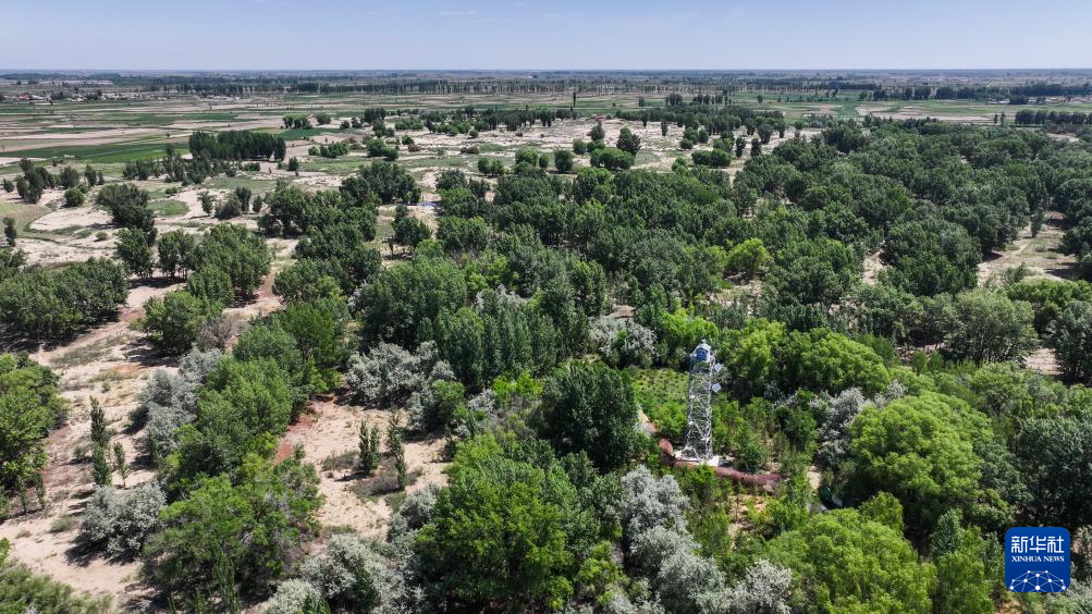 這是6月5日在巴彥淖爾市臨河區(qū)拍攝的郁郁蔥蔥的國營新華林場(無人機照片)新華社記者 連振 攝