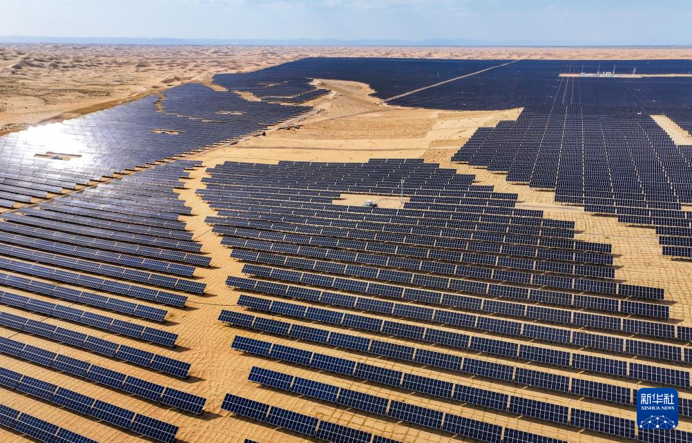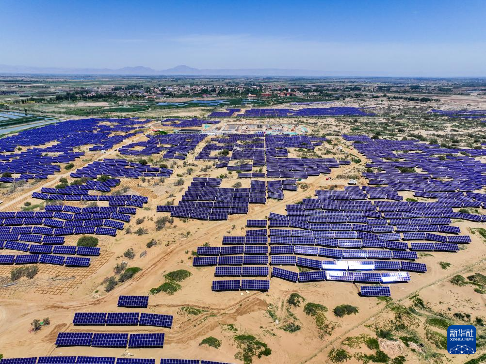 這是6月5日拍攝的位于巴彥淖爾市磴口縣的烏蘭布和東北部新能源基地100萬千瓦光伏先導工程項目,該項目地處烏蘭布和沙漠(無人機照片)新華社記者 連振 攝