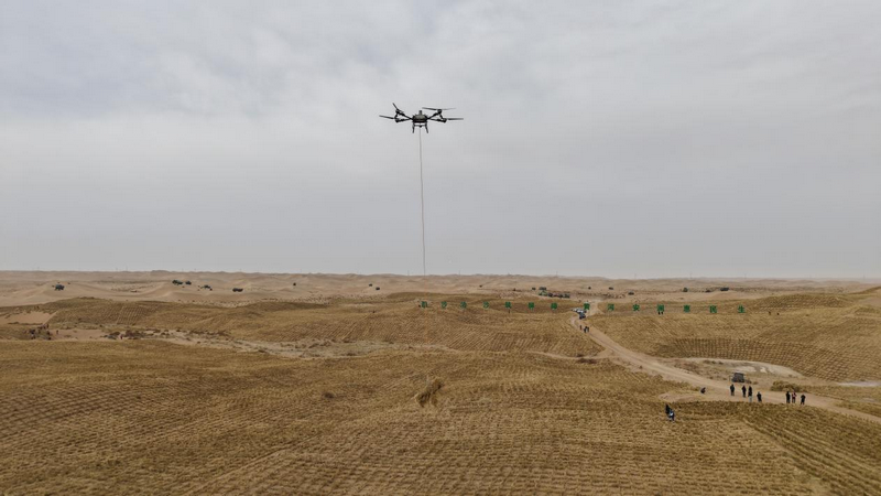當日上午10時,在黃河“幾字彎”西岸的項目現(xiàn)場,工程車輛整齊列隊蓄勢待發(fā),治沙工作者與建設(shè)人員精神抖擻,處處涌動著起步即沖刺、實干勇爭先的奮斗熱潮。隨著響亮的“開工”令下,現(xiàn)場機械轟鳴,打樁機精準作業(yè),無人機吊運草料,手扶式沙障機忙著扎設(shè)草方格……阿拉善盟“十五五”時期生態(tài)建設(shè)的首場戰(zhàn)役——2026年“三北”六期工程攻堅戰(zhàn)全面打響。