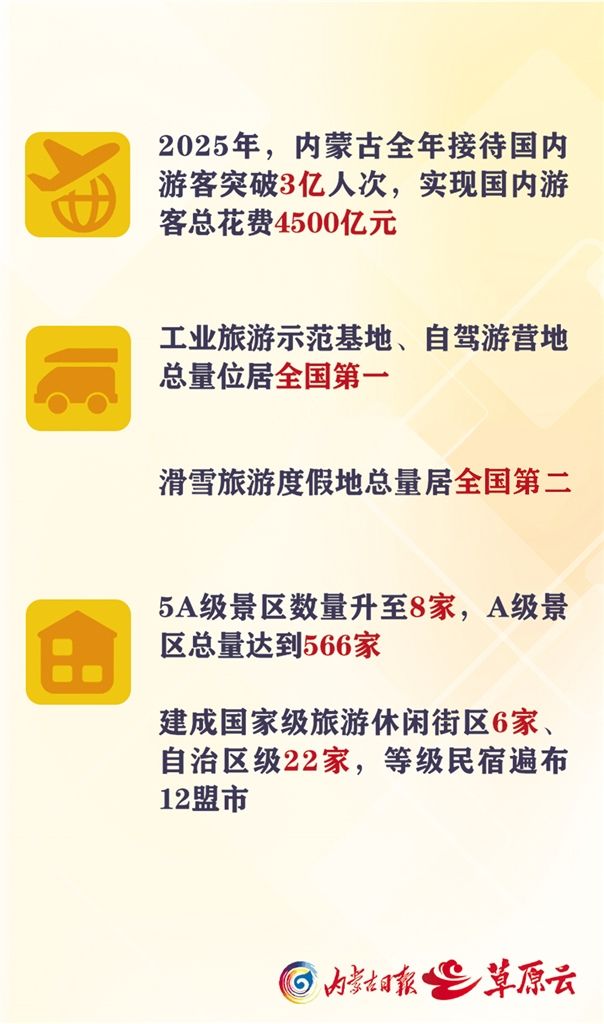 數(shù)據(jù)說話,最有分量。2025年,內(nèi)蒙古全年接待國內(nèi)游客突破3億人次,實現(xiàn)國內(nèi)游客總花費4500億元。