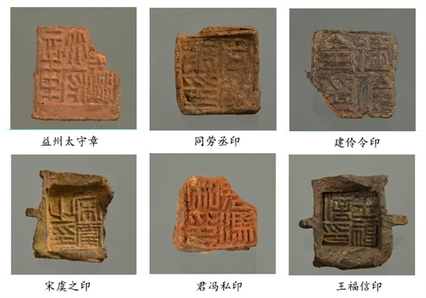 封泥集中出土于北部發(fā)掘區(qū)東北角的河道廢棄堆積中,共計837枚。主要為官印封泥和私印封泥,其中官印封泥有“益州太守章”“建伶令印”“同勞示印”等,涵蓋了漢代益州郡 24 縣中的20個縣名。出土帶字簡牘殘片 1000 余枚,不帶字的簡牘殘片近萬枚。其中,帶字簡牘中釋讀出“滇池以亭行”“建伶”“始元四年”等文字,應(yīng)是公文文書。