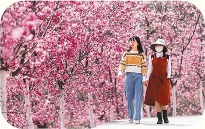 游客觀賞云南省宜良縣山后櫻花谷盛開的櫻花。 新華社記者 陳欣波攝