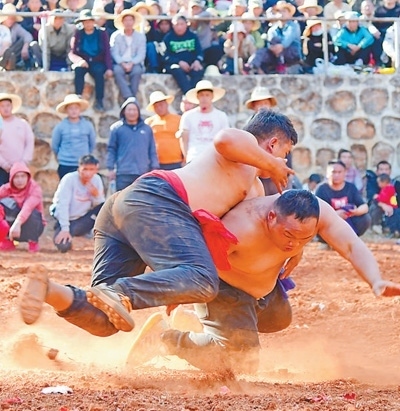 紅河哈尼族彝族自治州彌勒市西三鎮(zhèn)正在舉行彝族傳統(tǒng)摔跤比賽活動。普佳勇攝(人民視覺)