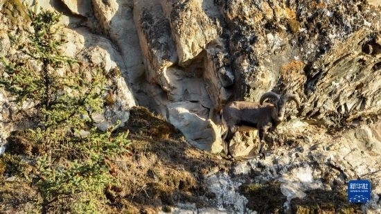5月11日在內(nèi)蒙古賀蘭山國(guó)家級(jí)自然保護(hù)區(qū)拍攝的巖壁上的巖羊(無(wú)人機(jī)照片)。