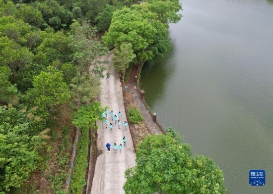 在海南瓊中縣舉辦的中國足協(xié)女足青訓(xùn)中心“希望杯”U12組比賽的空閑時(shí)段,四川隊(duì)隊(duì)員在賓館內(nèi)部道路跑步(無人機(jī)照片,4月10日攝)。