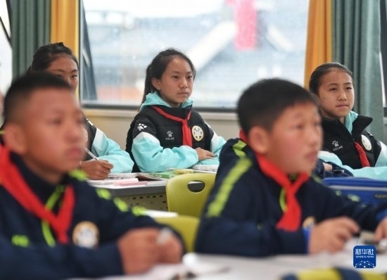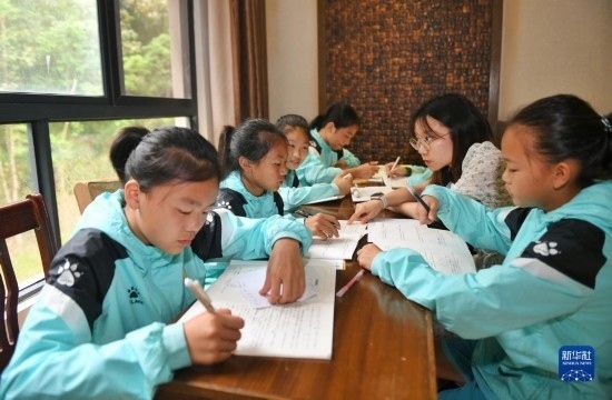 在海南瓊中縣舉辦的中國足協(xié)女足青訓(xùn)中心“希望杯”U12組比賽的空閑時(shí)段,來自涼山彝族自治州的四川隊(duì)隊(duì)員舍布么扯鳩莫(左二)和隊(duì)友們?cè)诶蠋煄ьI(lǐng)下學(xué)習(xí)文化課(4月10日攝)。