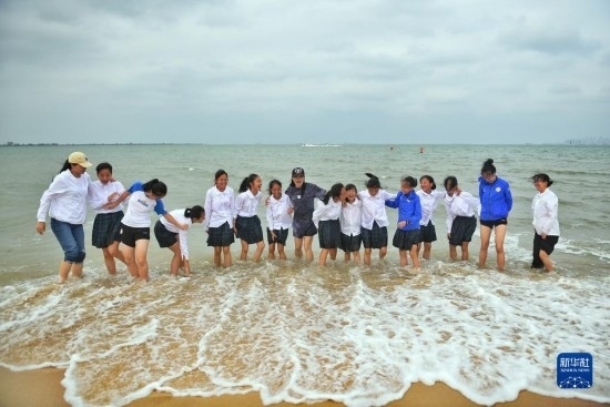 在海南瓊中縣舉辦的中國足協(xié)女足青訓(xùn)中心“希望杯”U12組比賽結(jié)束后,四川隊(duì)教練團(tuán)隊(duì)帶領(lǐng)隊(duì)員在海邊游玩(4月11日攝)。