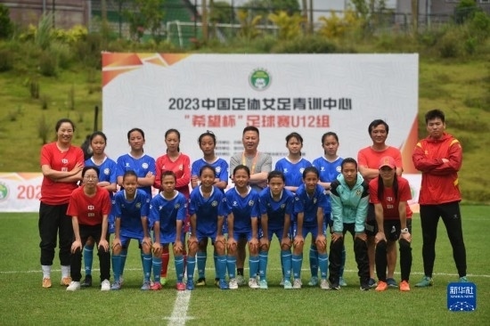 在海南瓊中縣舉辦的中國足協(xié)女足青訓(xùn)中心“希望杯”U12組四川隊(duì)對(duì)陣廣東隊(duì)的比賽后,四川隊(duì)成員在球場(chǎng)合影(4月10日攝)。