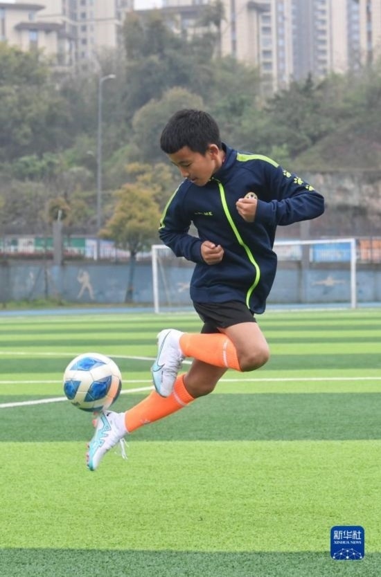在瀘州天立春雨學(xué)校足球場(chǎng),來自涼山彝族自治州的楊坤在進(jìn)行訓(xùn)練(3月28日攝)。
