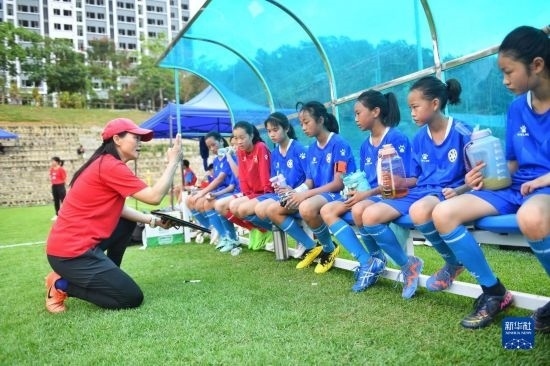 在海南瓊中縣舉辦的中國足協(xié)女足青訓(xùn)中心“希望杯”U12組四川隊(duì)對(duì)陣廣東隊(duì)比賽的中場(chǎng)休息時(shí)間,來自涼山彝族自治州的四川隊(duì)隊(duì)員舍布么扯鳩莫(右三)與隊(duì)友們?cè)诼犞鹘叹氷惾A布置戰(zhàn)術(shù)(4月10日攝)。