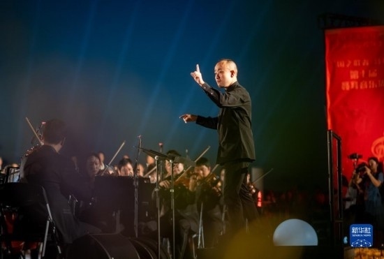 來自昆明聶耳交響樂團(tuán)及昆明市民族歌舞劇院民樂團(tuán)的演奏家們?cè)诶ッ魇械岢嘏瞎餐葑喟ā读x勇軍進(jìn)行曲》《賣報(bào)歌》在內(nèi)的聶耳代表作(7月17日攝)。