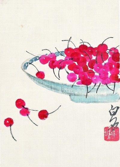 展柜中,不大的冊(cè)頁(yè)引得眾人圍觀。顆顆櫻桃被齊白石描繪得鮮嫩欲滴,它們擠在一個(gè)素樸的青花瓷盤中,還有幾顆散落在外,尤其鮮亮奪目?!侗P中櫻桃》是齊白石《聚珍十開冊(cè)》中的一幅,作于20世紀(jì)30年代。在這套冊(cè)頁(yè)中,無論是荷花游魚、麥穗螞蚱還是汀渚魚鷹,都在齊白石筆下顯得格外逼真?zhèn)魃瘛?/p>