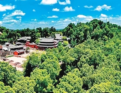 遠(yuǎn)眺四川省梓潼縣七曲山風(fēng)景區(qū),綠樹(shù)藍(lán)天相映成趣。本文圖片均由李 貧攝