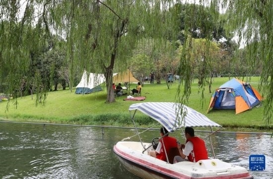 10月4日,在上海閔行體育公園,游船從岸邊露營(yíng)地旁劃過。