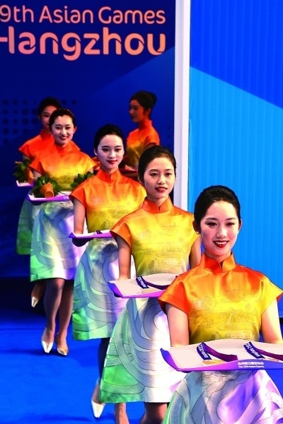 9月30日,亞運(yùn)會跳水項(xiàng)目頒獎儀式上,禮儀人員手托裝有獎牌的托盤,面帶笑容走向頒獎臺。本報記者 楊震攝/光明圖片