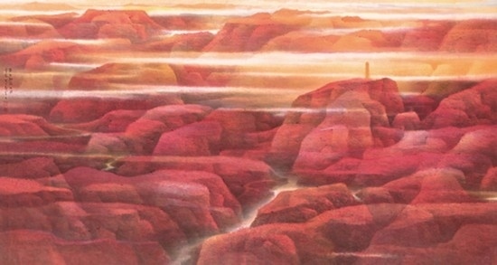 來自上海并深受海派畫學(xué)影響的樂震文、張弛,在宋元及明清山水畫學(xué)上打下了深厚的功底,也因此,他們的傳統(tǒng)山水畫深受日本民眾的歡迎。他們曾游居?xùn)|瀛多年,轉(zhuǎn)道再度研習(xí)了中國傳統(tǒng)文人畫。但真正改變他們畫風(fēng)的,卻是他們對中國北方大山大水的寫生攬勝。他們鐘情于英雄的太行山,忘情于革命勝地陜北高原,力求通過壯闊雄渾的山巒、連綿逶迤的群峰來表達(dá)他們的時代感悟,營構(gòu)儲存于他們胸中的山川氣象。所謂“山河回聲”,正是這些作品抒發(fā)的中華民族歷經(jīng)歲月風(fēng)華在大好河山之中回響的奮斗激情。
