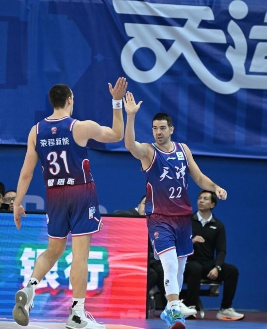 12月2日,天津隊球員羅切斯特(右)與隊友詹姆斯慶祝得分。新華社記者 孫凡越 攝