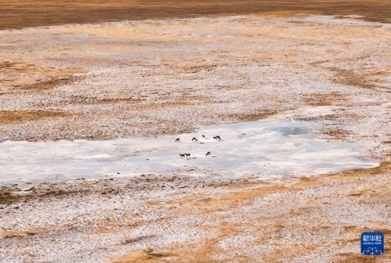 阿爾金山國家級自然保護區(qū),一群藏羚在冰河上(無人機照片,12月22日攝)。