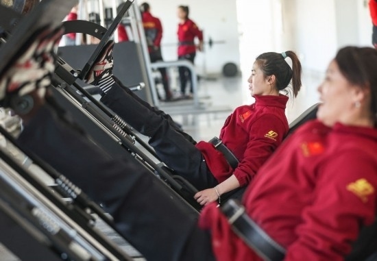 48歲的田甜在隊伍中打頭繩,也是隊員們的老大姐。因為膝蓋有傷,她訓練時沒法做負重深蹲,她就做腿部蹬舉。130公斤的蹬舉,每組120個,她每天會多做好幾組?!坝柧毐荣?,誰也不能掉隊,就像一根繩,少了哪股都不行?!碧锾鹫f。