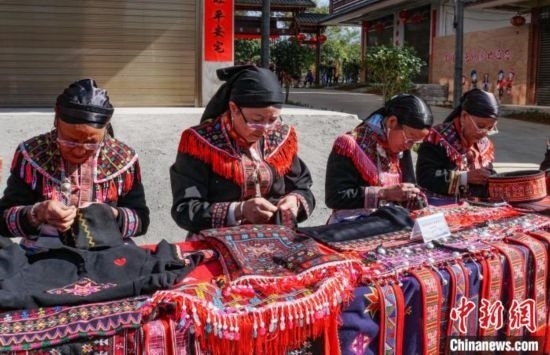 盤王節(jié)上,瑤族婦女現(xiàn)場(chǎng)展示反面繡技藝。 蔣豐慧 攝