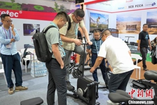 5月1日,采購(gòu)商在廣交會(huì)上嘗試專(zhuān)業(yè)健身器械。中新社記者 陳驥旻 攝