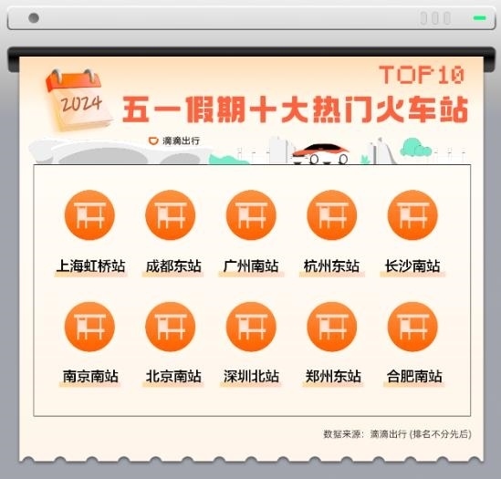 跨城跨省出游帶動(dòng)下,五一假期前往大型交通樞紐的打車(chē)需求環(huán)比節(jié)前上漲73%。從叫車(chē)需求量看,上海虹橋站、成都東站、廣州南站等領(lǐng)銜今年五一十大熱門(mén)火車(chē)站。在相關(guān)主管部門(mén)指導(dǎo)下,滴滴在北京、長(zhǎng)沙、成都、臨沂、泉州、廈門(mén)等地組建保障車(chē)隊(duì),在重點(diǎn)場(chǎng)站、景區(qū)等場(chǎng)景,協(xié)助進(jìn)行出行高峰時(shí)段的旅客疏散和轉(zhuǎn)運(yùn)。