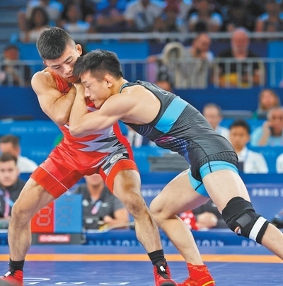 作為2023年摔跤世錦賽該級別銅牌得主,“站上領(lǐng)獎臺”是曹利國在巴黎奧運(yùn)會的目標(biāo)。雖然他在首場比賽中有些緊張,但還是以6∶2戰(zhàn)勝埃及隊(duì)選手穆阿蒙·穆罕默德。在1/4決賽中,他表現(xiàn)得更加自如,以5∶3戰(zhàn)勝委內(nèi)瑞拉隊(duì)選手羅德里格斯·奧羅斯科。半決賽曹利國對陣朝鮮隊(duì)選手李世雄,他在1∶3落后的情況下,最后時(shí)刻憑借邊界一記提抱摔將比分追至3∶3,憑借后得分取勝。