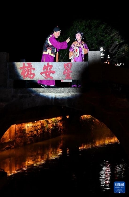 9月30日,演員在福州上下杭三捷河的星安橋上表演新閩劇《貽順哥燭蒂》。