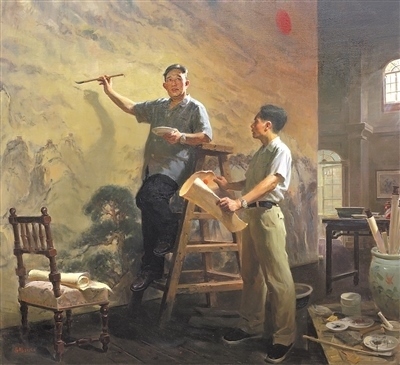 正在舉辦的第十四屆全國美術(shù)作品展覽進(jìn)京作品展上,撲面而來的藝術(shù)形象是腳踏中華大地的各族人民,是中國近現(xiàn)代文化史上的先賢圣哲,是和我們一道相擁而立的堂堂中國人。這些形象剛強(qiáng)勇毅,如潮如云,傳遞著眾志成城的精神力量,扣動人心。譬如,呂鵬《山河頌》,以濃郁的色調(diào),再現(xiàn)傅抱石、關(guān)山月兩位前輩創(chuàng)作《江山如此多嬌》的情景,鐫刻新中國美術(shù)史上重要一幕;鄔大勇《我心中的英雄》塑造了畫家少年時(shí)代的英雄偶像——錢學(xué)森等一代科學(xué)家。還有許多氣勢宏大的創(chuàng)作,它們既是社會生活、時(shí)代精神的藝術(shù)載體,又是美術(shù)工作者面對歷史、面對人民的激情熔爐。這些作品以人民形象為根基,深植時(shí)代沃土,構(gòu)成歷史與現(xiàn)實(shí)相輝映的史詩畫卷。