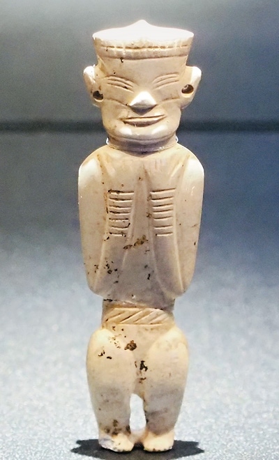 凌家灘遺址共出土6件完整的玉人,3件為立姿,3件為坐姿,此次展出其中4件。玉人皆為方臉,以陰線刻出“介”字形方格紋冠,兩耳垂處各有一圓形鉆孔,以示穿戴耳飾之用,腰間雕出斜紋帶飾。除姿勢不同外,6件玉人的差異在于腕部陰刻的手鐲數(shù)量不同,分別有5個(gè)、6個(gè)、7個(gè)。它們背后都有斜向?qū)︺@的穿孔,可穿綴在特定載體上作為祭祀禮器使用。孔徑僅1.5毫米左右,表明當(dāng)時(shí)的鉆孔技術(shù)已達(dá)到令人驚嘆的程度。玉人服飾精美,表情莊重,雙臂貼胸,十指分開,似為禮神致敬之姿,可能表現(xiàn)了凌家灘高等級貴族中巫師的形象。