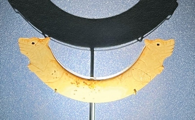 雙虎首玉璜兩端雕出虎首形,陰刻出鼻、嘴,以兩面管鉆孔為眼,面部淺浮雕耳、吻部,前肢收于身前呈伏臥狀,以陰刻線紋表現(xiàn)虎斑紋理。這件虎頭璜造型獨(dú)特,形象逼真,萌態(tài)可掬。