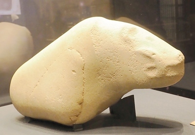 此次展覽以多媒體形式介紹了這座“王者之墓”的形制和隨葬品,并展示了墓中出土的重要文物。玉石豬是目前國內(nèi)考古發(fā)現(xiàn)的同時(shí)代最大、最重的玉雕作品。豬拱部凸出,其上有兩個(gè)鼻孔,嘴兩側(cè)刻上彎的獠牙,應(yīng)為野豬形態(tài)。眼和豎耳用減地法表現(xiàn),頸部寬而淺,腹部一側(cè)刻兩條彎曲的線,象征蜷曲的雙腿。這件大玉豬發(fā)現(xiàn)于墓口上方而不是墓底,可能有某種指示或鎮(zhèn)墓功能。