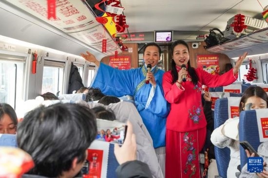 春運前夕,中國鐵路上海局集團有限公司合肥客運段組織由鐵路職工組成的非遺表演小分隊登上C3685次旅客列車,為車廂內(nèi)的旅客帶來“廬州蛋雕”和黃梅戲表演等,并為旅客送上祝福。