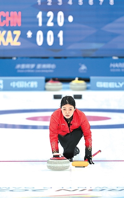 中國隊選手韓雨在亞冬會冰壺混雙比賽中擲壺。