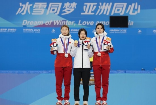2月8日,冠軍韓國選手金吉莉(中)、亞軍中國選手公俐(左)和季軍中國選手臧一澤在頒獎儀式上合影。當(dāng)日,在哈爾濱舉行的第九屆亞冬會短道速滑女子1500米A組決賽中,韓國選手金吉莉奪得冠軍,中國選手公俐、臧一澤分別獲得亞軍、季軍。新華社記者 張濤 攝