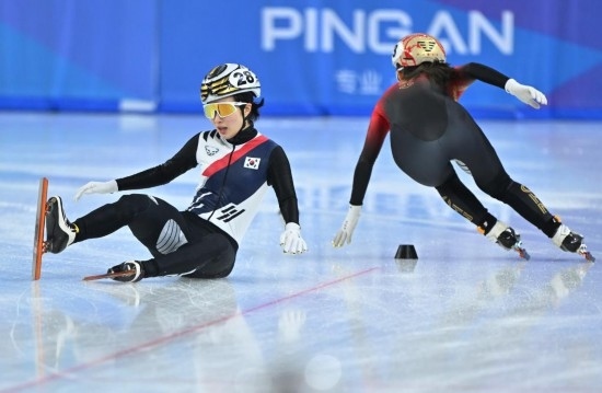 2月9日,中國隊選手公俐(右)在比賽中沖刺,韓國隊選手金吉莉在比賽中摔倒。新華社記者 江漢 攝