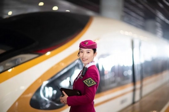除夕當(dāng)天,復(fù)興號上的乘務(wù)員送出祝福。
