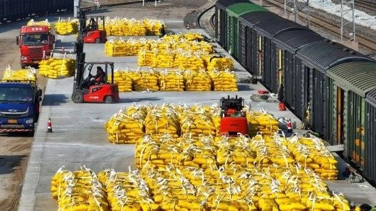 2月11日,石家莊鐵路物流中心辛集營業(yè)部晉州貨場內(nèi),一袋袋化肥從棚車卸下,準備運往田間地頭。