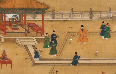 捶者,打也;丸者,球也。“不少學(xué)生剛接觸捶丸時,說它像現(xiàn)代的高爾夫。其實,捶丸比高爾夫運動歷史更悠久?!逼巾斏綄W(xué)院陶瓷學(xué)院院長梅國建介紹,捶丸源自唐代擊鞠(馬球)和步打球,傳至宋朝逐漸演變?yōu)橐来螕羟虻姆菍剐员荣悾Q也變?yōu)榇吠?,現(xiàn)藏于故宮博物院的《明宣宗行樂圖》中就描繪了宮中捶丸的場景。