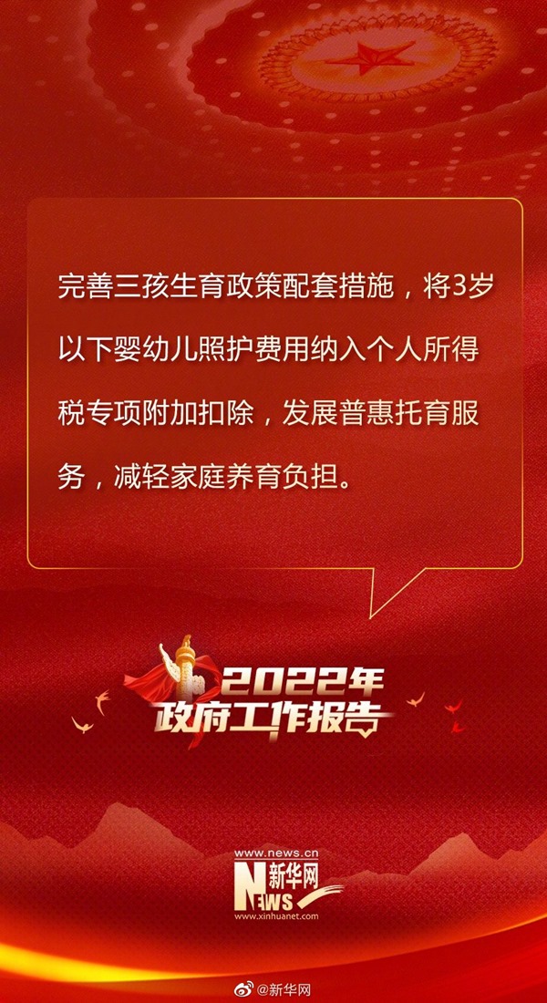 加強(qiáng)社會保障和服務(wù)。穩(wěn)步實施企業(yè)職工基本養(yǎng)老保險全國統(tǒng)籌,適當(dāng)提高退休人員基本養(yǎng)老金和城鄉(xiāng)居民基礎(chǔ)養(yǎng)老金標(biāo)準(zhǔn),確保按時足額發(fā)放。繼續(xù)規(guī)范發(fā)展第三支柱養(yǎng)老保險。加快推進(jìn)工傷和失業(yè)保險省級統(tǒng)籌。做好軍人軍屬、退役軍人和其他優(yōu)撫對象優(yōu)待撫恤工作。積極應(yīng)對人口老齡化,優(yōu)化城鄉(xiāng)養(yǎng)老服務(wù)供給,支持社會力量提供日間照料、助餐助潔、康復(fù)護(hù)理等服務(wù),鼓勵發(fā)展農(nóng)村互助式養(yǎng)老服務(wù),推動老齡事業(yè)和產(chǎn)業(yè)高質(zhì)量發(fā)展。完善三孩生育政策配套措施,將3歲以下嬰幼兒照護(hù)費用納入個人所得稅專項附加扣除,發(fā)展普惠托育服務(wù),減輕家庭養(yǎng)育負(fù)擔(dān)。強(qiáng)化未成年人保護(hù)。提升殘疾預(yù)防和康復(fù)服務(wù)水平。加強(qiáng)民生兜底保障和遇困群眾救助,努力做到應(yīng)保盡保、應(yīng)助盡助。