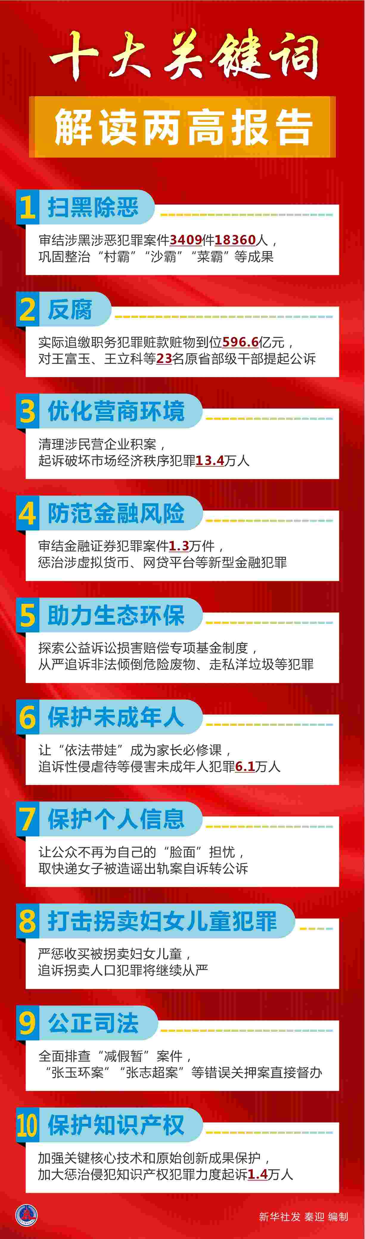 兩高報(bào)告凸顯依法治國的決心與力度。點(diǎn)名秦光榮、王富玉、王立科等落馬腐敗分子,提及陶革涉黑案、張玉環(huán)案、取快遞女子被造謠出軌案等引發(fā)社會(huì)關(guān)注的案件。常態(tài)化掃黑除惡、高壓反腐、打擊拐賣婦女兒童犯罪、保護(hù)公民個(gè)人信息等法治重點(diǎn),與群眾關(guān)切高度契合。