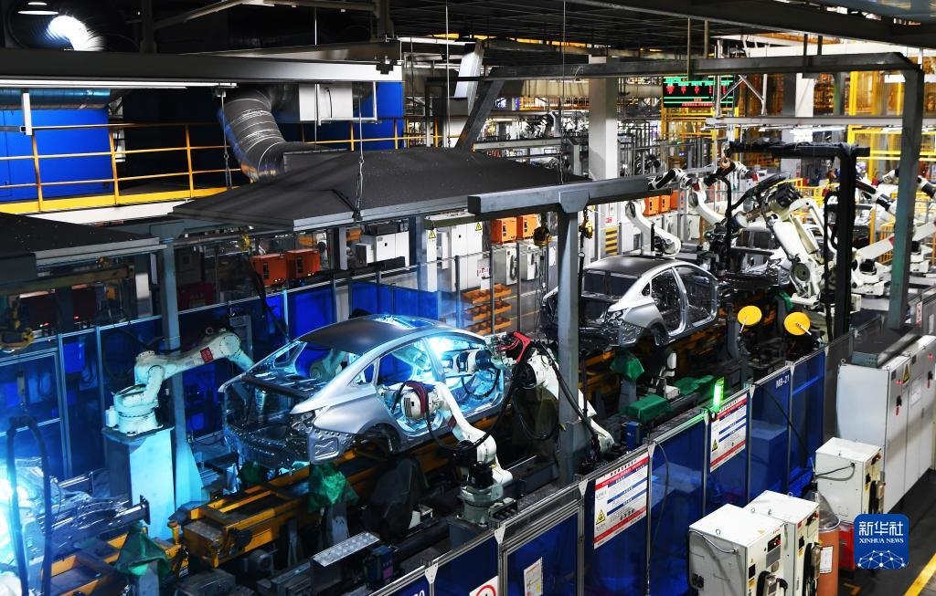 在重慶兩江新區(qū)的長安汽車兩江智能工廠,工業(yè)機器人在焊接車間的流水線上作業(yè)(2020年7月21日攝)。新華社記者 王全超 攝